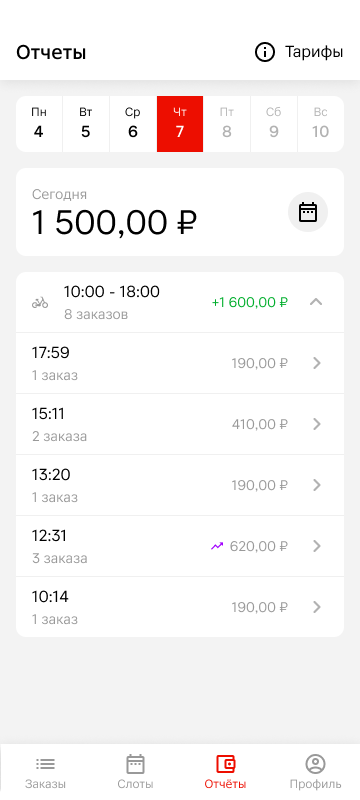 Выплаты поступают каждую неделю — по четвергам, за заказы прошлой календарной недели. Например, если ваш первый слот был в понедельник 1 октября, первая выплата поступит в четверг 11 октября.