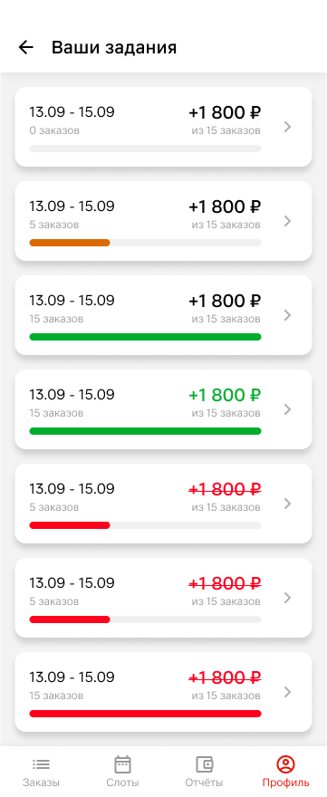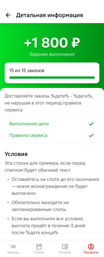 Иногда мы назначаем курьерам персональные цели. Это определённое количество заказов, которое нужно выполнить за заданный период. Если вы достигаете цели — получаете вознаграждение
